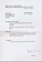 Very beautiful sheet margin copy of 5 kopek large pearls in the scarcer greenish blue shade with very wide to full margins on the front of a cover from "WASA 29. DEC 1859" to JAKOBSTAD ("ANK 31/12"). Like often in WASA the stamp cancelled only with a beautiful ink cross and the postmark along side. Interesting usage from the last days of the validity! Cert. Tuori. VERY FINESold at Live-Auction