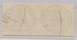 An exceptional pair of 5 kopek large pearls blue with wide to full margins cancelled with two beautiful ink crosses. A slight crease between the two stamps, well away from both stamp pictures and ending with a small tear at bottom. F=80.000. Cert. Gummesson. EXHIBITION PIECESold at Live-Auction
