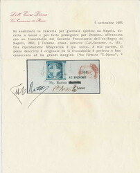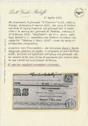 Unique with Vertical Margin Line The rare 10 cent newspaper tax stamp of 1859 in a margin copy on a large part of the Paris newspaper "L´Univers" No. 64 of "6 Mars 1859" canc. in Modena 9.3 1859. Vertical margin line at left, which is normally horizontal. This is acc. to Enzo Diena the only one he has seen. Sass. # 5c. Certs Giulio Bolaffi, Enzo Diena & Paolo Vaccari. EXHIBITION RARITYLive Auction
